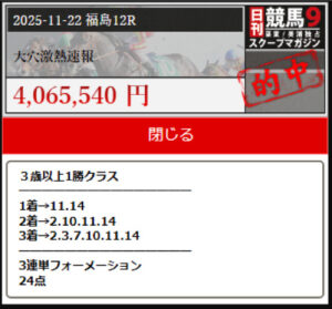翌日、買い目通りの馬券を購入した日刊競馬9( ナイン )は、19万4320円の配当と「競馬情報の核心」を手に入れた。